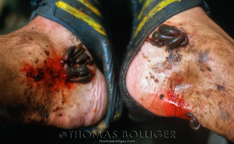 Tag und Nacht wird man von Myriaden Ameisen, Mücken, Sandfliegen, Bienen, Wespen, Blutsaugenden Fliegen und den allgegenwärtigen Blutegeln drangsaliert, im allgemeinen nicht oder nicht unmittelbar lebensgefährliche Widrigkeiten. Bienen- und Wespenangriffe im Schwarm können jedoch durchaus traumatische Wirkung zeigen. Durch Insekten übertragene Krankheiten wie Malaria und Dengue sind regional ebenfalls stark präsent. Infizierte Schrammen, steckengebliebene Dornen und wunde Füsse (sogenannter trenchfoot mit begleitender starker Entzündung) sind auf langen Treks häufig nicht vermeidbar.